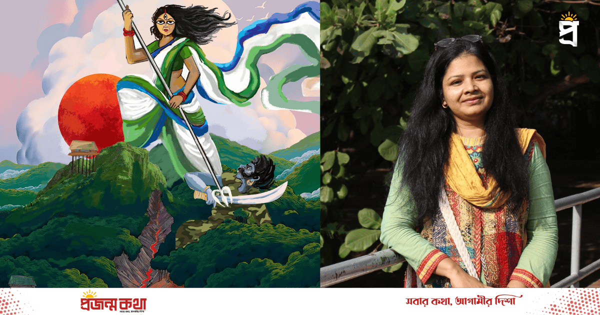 গবেষক মনীষা দেওয়ান বলেন, আমাদের সংগ্রামকে প্রতীকে তুলে ধরতে গিয়ে আমাদের অস্তিত্বই বাদ দেওয়া হয়েছে। এটি প্রতীকী শূন্যতা তৈরি করেছে। বাইরের দেবী এসে আমাদের রক্ষা করছেন- এটি এক ধরনের ‘মেসায়ানিক ন্যারেটিভ’, যা আমাদের বাস্তবতাকে ছোট করে।