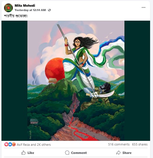 জনপ্রিয় অনলাইন একটিভিস্ট পিনাকী ভট্টাচার্য তার এক ফেসবুক পোস্টে বলেন, ছাত্র ইউনিয়নের নেত্রী মিতা মেহেদী সেনাবাহিনীকে অসুর বানিয়েছে তার দুর্গাপূজার চিত্রকর্মে। এই বাম পোগতিশীলরা নিজেরাই ধর্ম নিয়ে রাজনীতি করতে নেমে গেছে। এরাই ধর্মব্যবসায়ী। শেইমলেস।