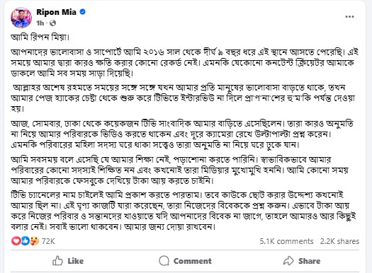 রিপন মিয়া লিখেছেন, আপনাদের ভালোবাসা ও সাপোর্টে আমি ২০১৬ সাল থেকে দীর্ঘ ৯ বছর ধরে এই স্থানে আসতে পেরেছি। এই সময়ের মধ্যে আমার দ্বারা কারও ক্ষতি করার কোনো রেকর্ড নেই। এমনকি যেকোনো কনটেন্ট ক্রিয়েটর আমাকে ডাকলে আমি সবসময় সাড়া দিয়েছি।