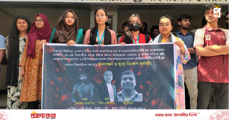 শনিবার (১৯ অক্টোবর) সকাল ১১টা ৩০ মিনিটে রাজধানীর মিরপুরে অবস্থিত বিশ্ববিদ্যালয়ের অস্থায়ী ক্যাম্পাস মেঘনা ভবনের সামনে শিক্ষার্থীরা বিক্ষোভ ও মানববন্ধন কর্মসূচি পালন করেন। এ সময় তারা হাতে প্ল্যাকার্ড ও ব্যানার নিয়ে ধর্ষণবিরোধী বিভিন্ন স্লোগান দেন এবং সারাদেশে নারী নির্যাতন ও ধর্ষণের ক্রমবর্ধমান ঘটনার তীব্র প্রতিবাদ জানান।