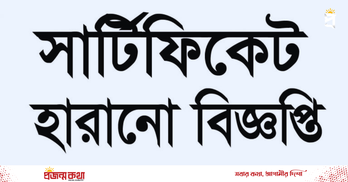 সার্টিফিকেট হারানো সংক্রান্ত বিজ্ঞপ্তি আমি, মোঃ নূর এ এলাহী, জানাচ্ছি যে, আমার নিম্নোক্ত শিক্ষাগত সনদের মূল সার্টিফিকেটসমূহ হারিয়ে গেছে: এসএসসি