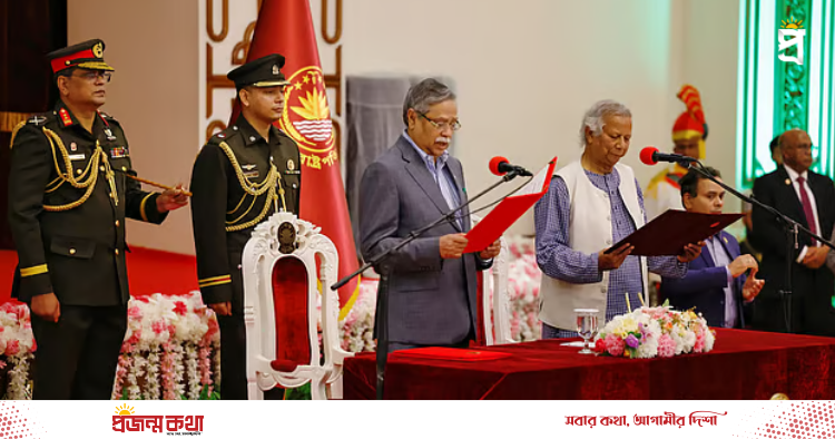 রাষ্ট্রপতি মো. সাহাবুদ্দিন ২০২৪ সালের ৮ আগস্ট অন্তর্বর্তী সরকারের প্রধান হিসেবে অধ্যাপক মুহাম্মদ ইউনূসকে শপথ পড়ান | ফাইল ছবি: রয়টার্স