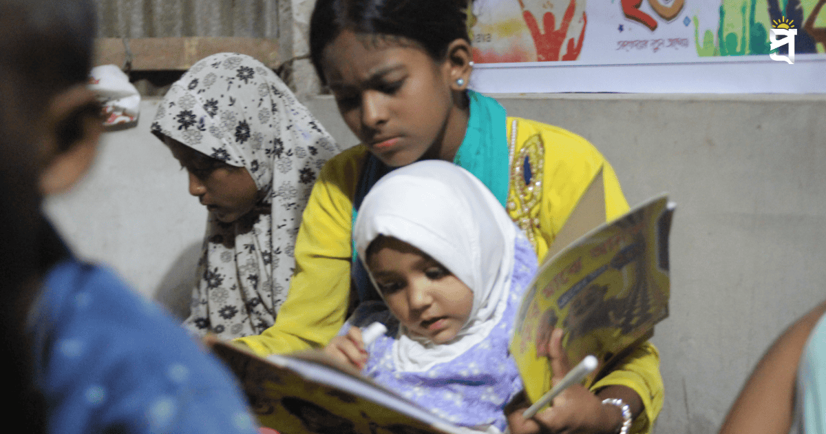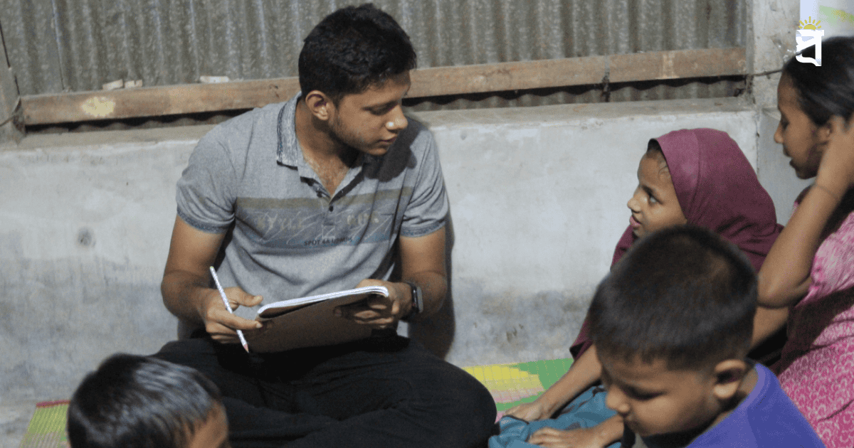 পাঠদান কর্মসূচির অংশ হিসেবে বন্ধু মিরাজ খুদে শিক্ষার্থীদের মনোযোগ সহকারে পড়াশোনা করাচ্ছেন | ছবি: প্রজন্ম কথা